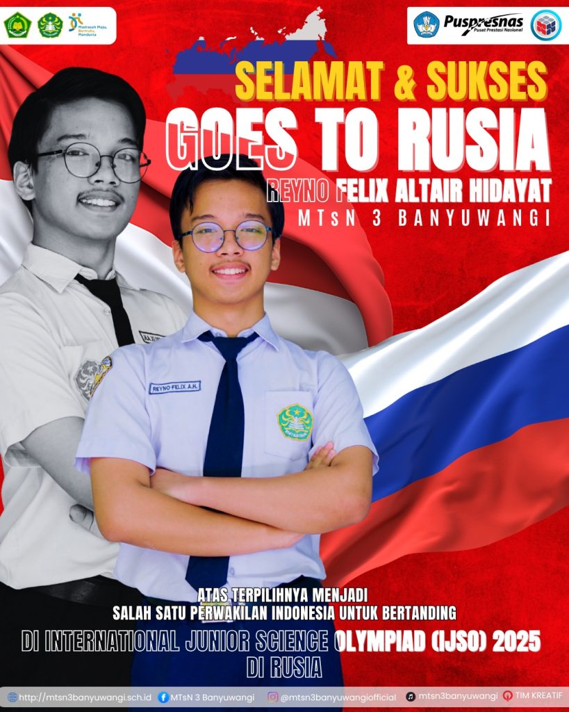 Kepala MTsN 3 Banyuwangi, dalam keterangannya, menyampaikan rasa syukur dan bangga atas prestasi gemilang ini. “Reyno adalah contoh nyata bahwa kerja keras dan semangat belajar tanpa henti akan selalu berbuah hasil yang luar biasa. Semoga Reyno dapat memberikan yang terbaik untuk Indonesia dan membawa pulang prestasi gemilang dari Rusia,” ujarnya.